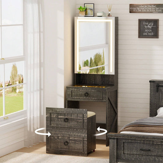GLAMORA™ 7-in-1 Vanity Table with LED Mirror, Chair, Charging Station & Hidden Compartments